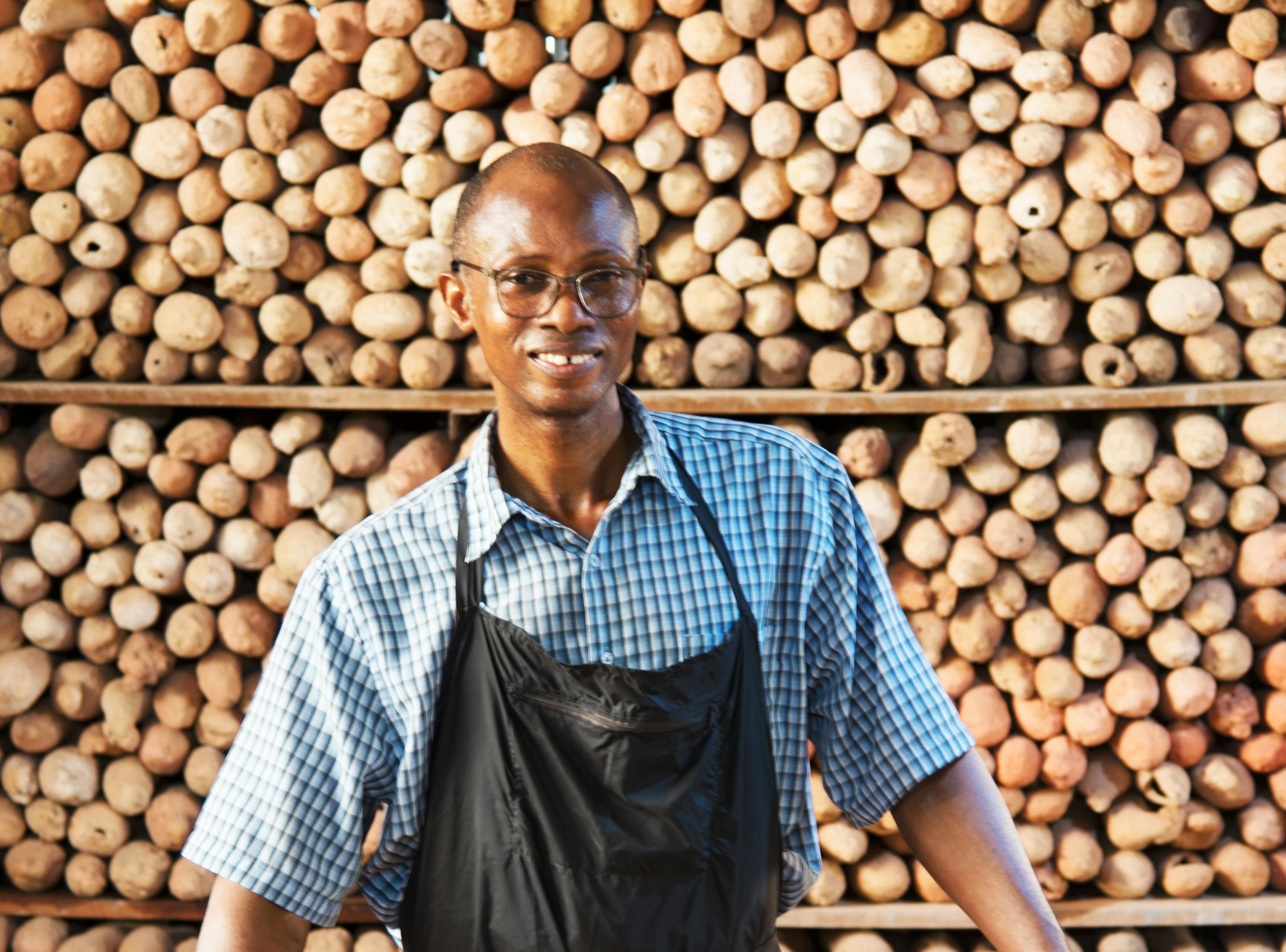 Nigerian ceramicist Ozioma Onuzulike creates large-scale works resembling tapestries, meticulously crafted from thousands of ceramic palm kernel beads and natural palm kernel shells, that serve as metaphors for the historical and sociological roots of turmoil in Africa.